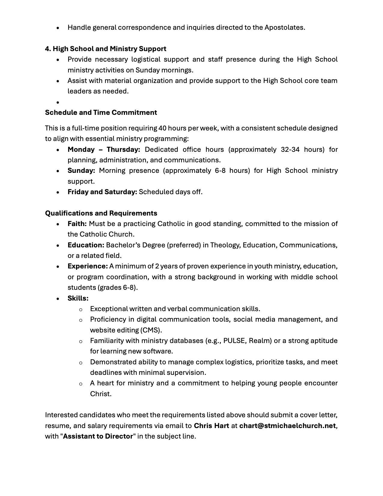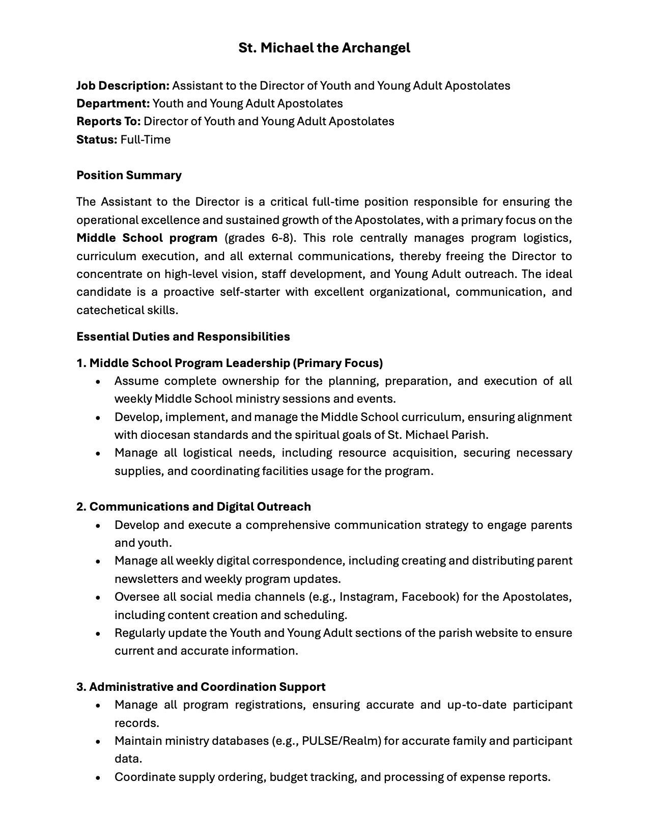 The Assistant to the Director of Youth and Young Adult Apostolates is a full-time role dedicated to supporting the growth and smooth operation of the Apostolates, with a primary focus on the Middle School program (grades 6–8).