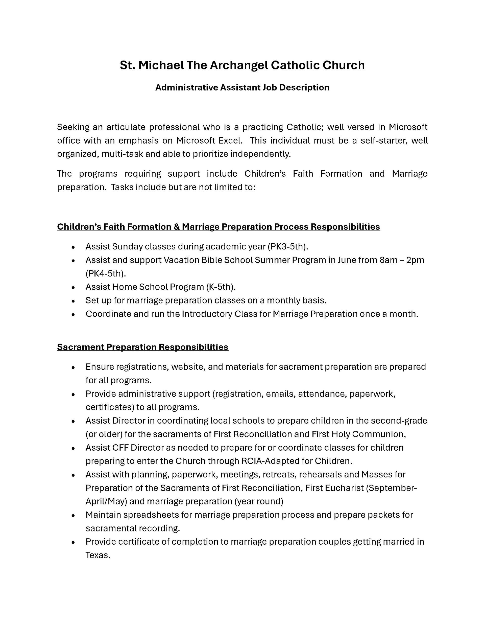 We are Hiring for an Administrative Assistant for Children's Faith Formation and Marriage Preparation