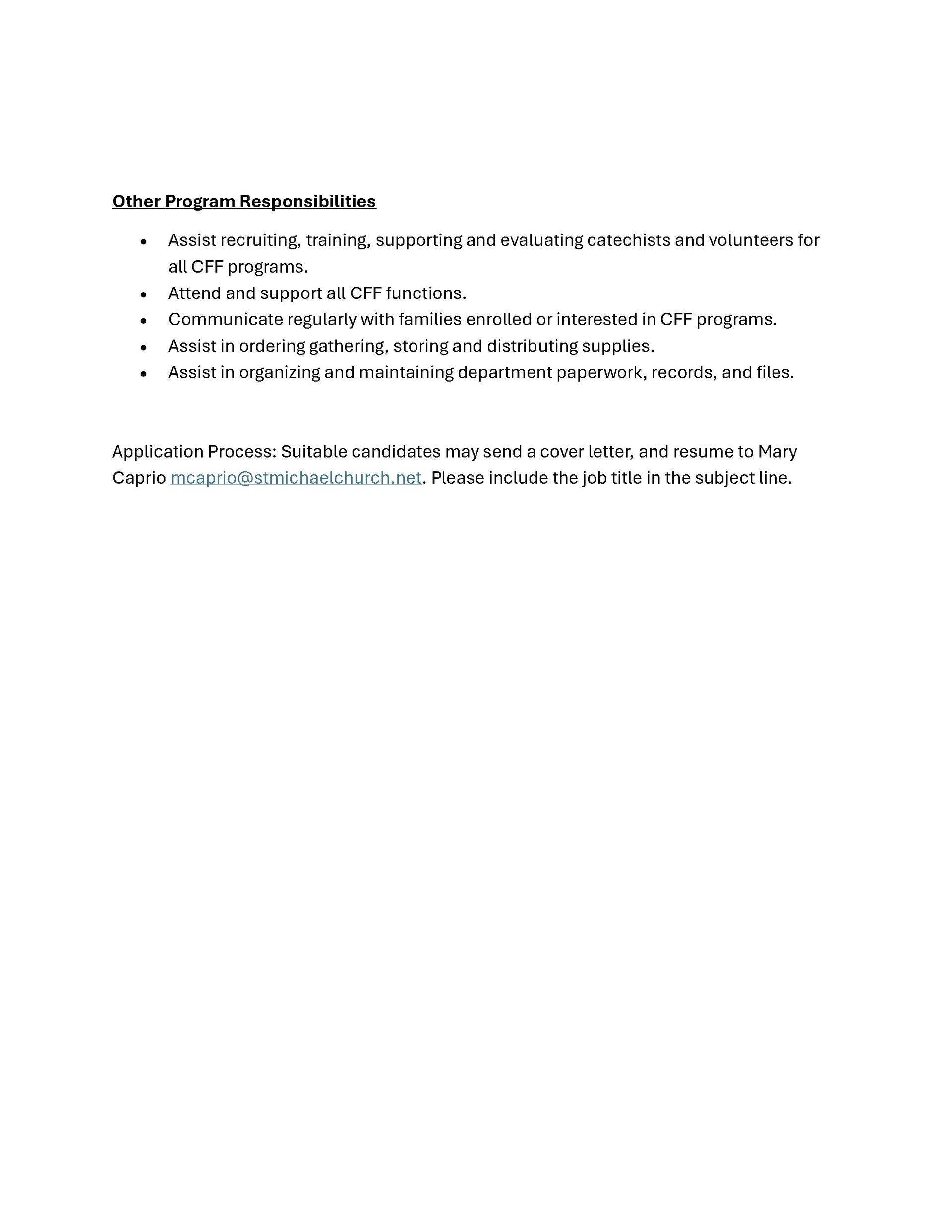 Interested candidates who meet the requirements listed above should submit a cover letter and resume via email to Mary Caprio at mcaprio@stmichaelchurch.net, with "Administrative Assistant" in the subject line.
